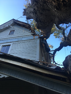 There is some damage to the house, but none of it is structural. We are very fortunate. There are people and places all along the lower eastern seaboard after two storms that are much worse off. Neither of us got hurt. We weren't living in the house any way. None of our belongings or furniture in the house got damaged. Everything is wood in that part of the house. No insulation, no drywall, no plaster. The tree didn't hit the chimney. It didn't break ANY of the windows (amazing!). And it didn't damage our porch rocker.